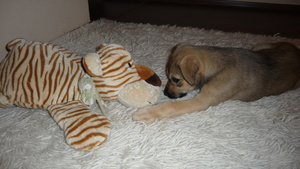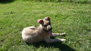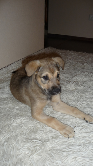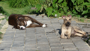 Боня чувствует себя хорошо, еще очень сильно хромает на переднюю левую лапку, но уже на нее опирается. Вообще очень игривая, уже начинает выполнять некотроые команды. В выходные думаем вывезти Боню на дачу, на свежий воздух, а там у родителей американский стафф,7 лет, очень добродушный,думаю подружатся.