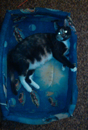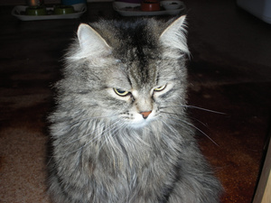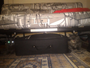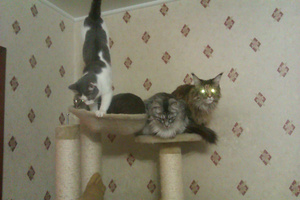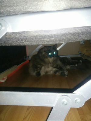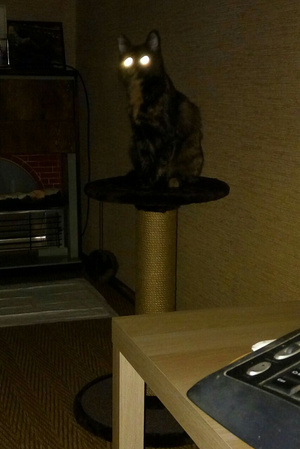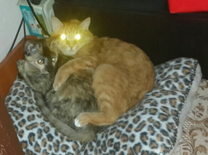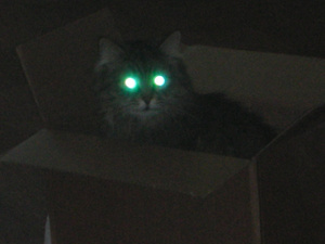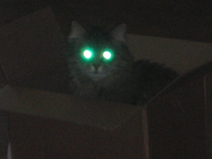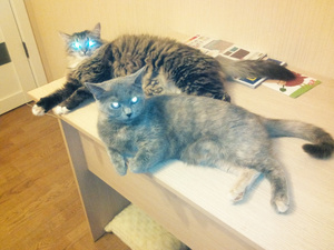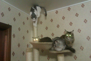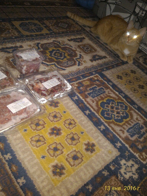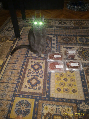 Привезли честно Ричем заработанный приз - мясо для кошек от Барбосса. Пыжик сразу подсветку на всю мощь включил.