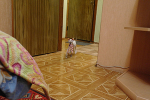 Еще он нас удивляет своим почти собачьим характером. Например носит палочку свою для игры. Если ее подальше закинуть, то он бежит и приносит ее в зубах.а вот это у вас - папино!
