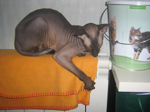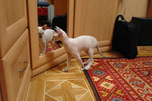 Альфик научился ходить на унитаз. Понадобилось нам как раз месяц с небольшим. Очень умененький малыш! Еще он нас удивляет своим почти собачьим характером. Например носит палочку свою для игры. Если ее подальше закинуть, то он бежит и приносит ее в зубах. Вообще, конечно очень необычное животное-сфинкс. Нельзя сказать, что это кошка. Получеловечек, полуобезьянка, еще и "чирикает" иногда, как птичка. В общем приносит море положительных эмоций