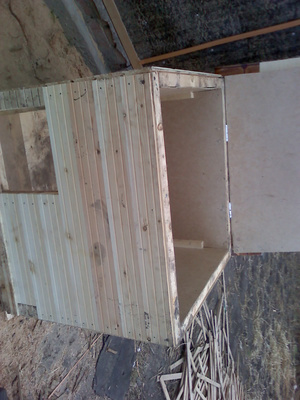 Будку мы сделали согласно описанию из интернета - утепленную цветным строительным пенопластом со всех сторон (стены-днище-крыша), со съемной крышей на дверных петлях, обработали дерево противоплесеневым препаратом. Теперь на днях привезут сено, и жить там будет Рыжий