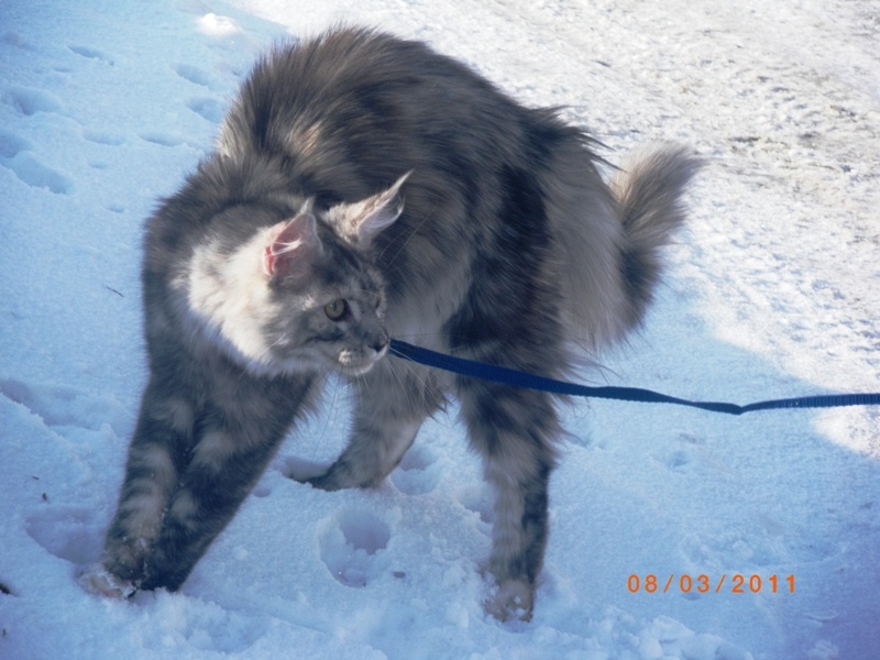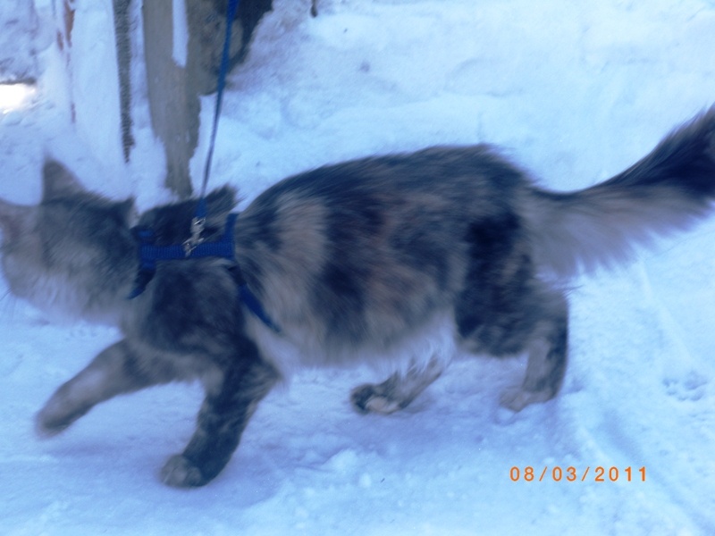 Гулять Кармен не боялась , но и особого восторга я не увидела. Вообще она умничка, первый раз одели шлейку- реакции ноль, как будто всю жизнь носила, у меня собака когда маленькая была, при одевании ошейника ложилась и боялась пошевелиться, а Кармен спокойно отнеслась к шлейке , а поводком, так сразу играть начала. На улице ей не понравился ветер, к снегу отнеслась спокойно, лапы не поджимала. Мимо проходящему человеку показала какой она очень страшный звер-р. Надеюсь будут теплые деньки, хочу с ней в лесок сходить