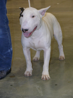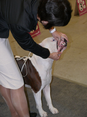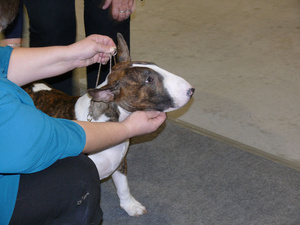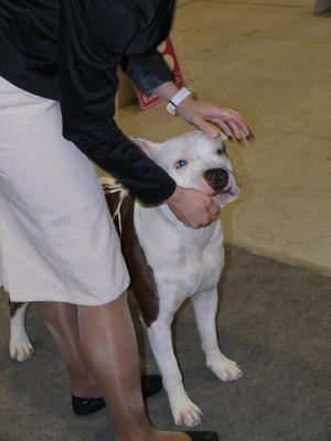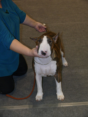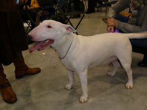 И она сказала, что она очень довольна бультерьерами на этой выставке, что все красавцы, соотношение головы и тела, прям хвалила их очень очень.