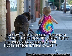 Умора, но паренек-то рисковал, т.к. собашко вполне могло воспринять сию "шутку" как покушение на любимую хозяйку, и начать ее защищать со всеми вытекающими...