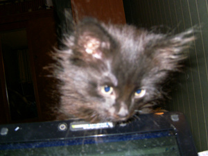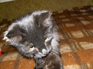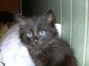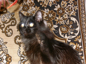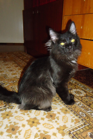 Когда привезла его, был чисто черным, за исключением малюсенького дымчатого галстучка. Сейчас вся грива дымчатая и пузо тоже.