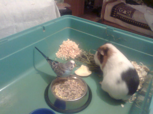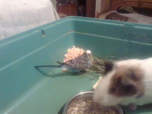. Короче, купили...Гаврик был куплен мимоходом...и жил как-то сам по себе (а после смерти от рака моей любимой ручной попугаихи Малышки остался один). Никто его не приручал особо, говорить мы его тоже не учили. Вот и вырос: независимый красавец-птиц. Живет он в вечно открытой клетке (куда залезает лишь на ночь), а днем летает по комнате, часто прилетает в гости к Борису (на котором откровенно паразитирует: купается в его пойлушке, выбирает вкусняшки из его кормушки, и даже иногда грызет его траву летом и его сено зимой). Иногда, под настроение, дает себя погладить (терпит), но обычно негодует при проявлении подобных вольностей: он птица независимая. Любимое занятие - крутиться на привязанной к крыше клетки длинной и прочно травинке, как акробат на трапеции. Самая нелюбимая процедура - подстрижка когтей. Впрочем, Гаврик животное адекватное и разумное: не кусается до крови и не орет, а просто молча, в негодовании слегка поклевывает мою руку: "отпустите, садисты!". В принципе, кличка ему очень подходит: Гаврик, он и есть Гаврик...