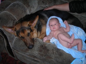 Много знакомых и друзей с собаками и детками. Сейчас у соседей лохматый песик и ребенок, воплне отлично все. А у друзей лет 15-20 назад двое детей было и аргентинский дог (+кот))) А сейчас боксер и уже внук. С пеленок вместе. Никогда проблем не было.