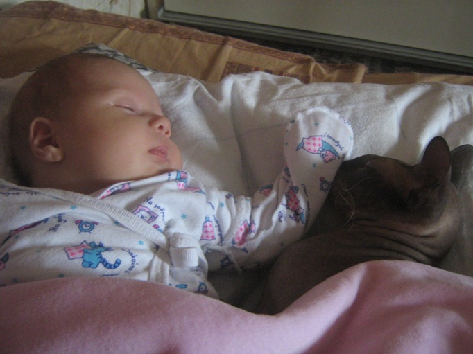 У меня была сиамская кошка Сима. Когда в доме появилась моя донечка, Сима не стесняясь нисколько, нагнув голову, пошла по ребенку, около личика остановилась, долго обнюхивала, а сама стояла всем весом на моей запеленутой крохе. Моя мама — в шоке. Я показываю всем, чтобы не двигались и молчали... Симка-кошка завершила ритуал и спокойно ушла по своим делам. С этих пор Сима стала нянькой: требовательной ко взрослым в семье, защищающей (я сама пострадала от кошкиных зубов за то, что не так стремительно побежала на детский плач). На любой недовольный писк — Сима бежала и звала идти и "спасать" малую. И караулила розовые сны моей дони — сидела-лежала рядом или такое место выбирала, чтобы кошке "сверху видно все" было и охраняемый объект в первую очередь.