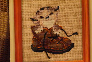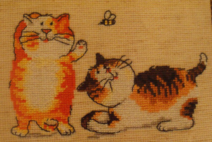 Я нашла фото. Кошки все подарены. А зайцев вышила очень много на подарки. Они такие прикольные.