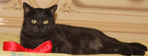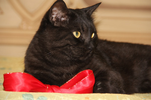 Если не брать в расчет вспышку "в лоб" (не у всех есть портативная вспышка, поэтому этот момент не важен), то замечания такие - с черными животными избегать поз, когда животное лежит боком к фотографу (я стараюсь избегать таких поз и при фотографировании цветных животных). У Вас кошка не чисто черная, тут ещё терпимо, а в основном при такой позе получается бесформенная масса. Тогда уж лучше резануть кадр, как на втором фото. Если животное не удается посадить-поставить, то лучше расположить его головой к фотографу. На третьем фото кошь смотрит в сторону и контур головы слился с телом. И на всех фото - я бы убрала огромный красный бант на переднем плане.