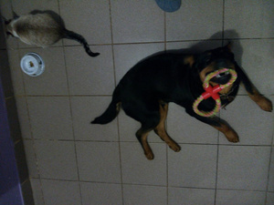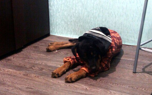 Ну и самый младший но самый крупный хвост - пёс, помесь дворняги с ротвером) Балбеееес)) Выращенный кототётками) По ночам они втихаря на нём спят, мнут его лапами, он тащится, но стоит выйти как они делают вид что ничего не было :secret: кошки же не дуры к псу ласкаться :yes.gif: