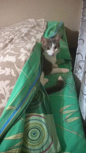 Научился в пледик заворачиваться, когда холодно на улице (дома при этом тепло, но он все равно стремится укутаться). В конце ноября решил, что пледика мало, под подушками-то гораздо уютнее получается :ха-ха!: