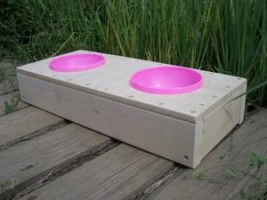 Миска на подставке (делали столик деревянный) Но он давно перерос этот столик, надо делать новый. Пока только миски заменили на бОльшие.
