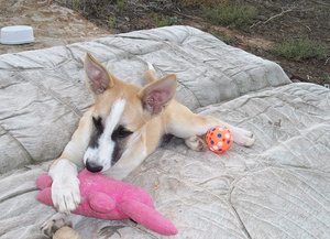 У него есть игрушки, но с ними он редко играется. В основном ему доставляет удовольствие прыгать , кусать за руки или воровать тапки и убегать с ними в зубах.Естественно, активный и общительный щен предпочитает не мусолить кусок резины или тряпки в одиночестве, а играть с хозяевами. А задача хозяев - предложить ему такую игру, которая бы устраивала всех