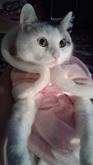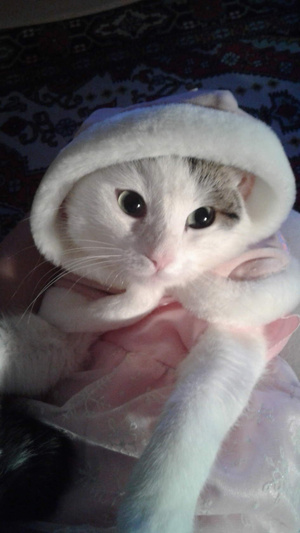 Хозяева Милы покупают ей всё розовое, а на Новый Год купили шубку Снегурочки, конечно, розовую
