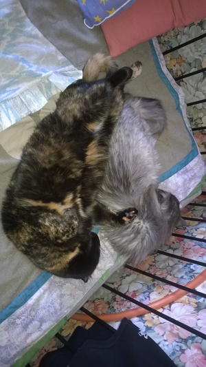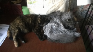 Сама, невольно, вспоминаю сейчас, как Миша, встретив меня, тут же погладиться залезть норовил, а после, уткнувшись мне в коленку или локоть, засыпал. А Тиша, погладившись, играть желал -- так и сидела: с уснувшим рядом, на коленке, Мишей и играющимся Тишей.