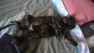 Она все такая же любимая домашняя кошка. Ласковая девушка-толстушка. Наконец-то добилась своего: Боня смирился и разрешает рядом спать и даже немножко терпит когда Касся его облизывает.