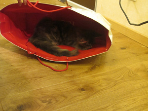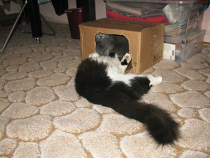у нас кот тоже так любит всякие коробки и пакеты, можно его в пакете переносить, он довольный))