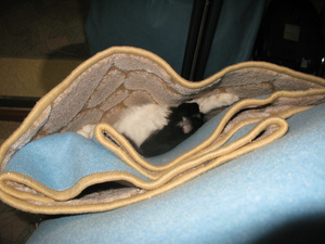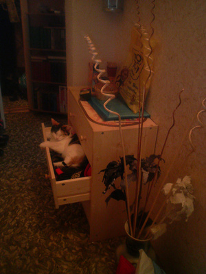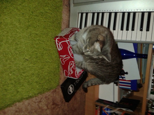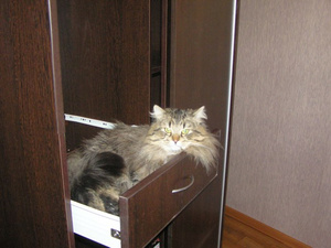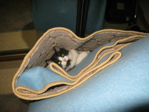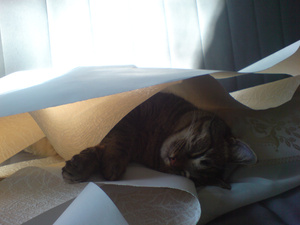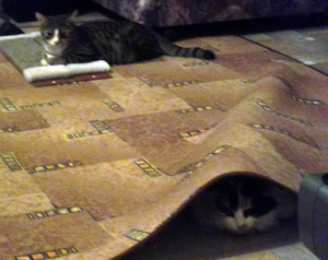 Купила новое ковровое покрытие. Пока стоит в углу (вертикально), ждет выкидывания старой мебели и старого покрытия. Так Кузька решил устроить там резиденцию и нападать оттуда на меня и на кошку-аборигенку!!