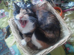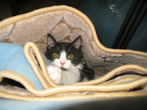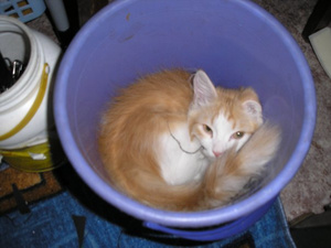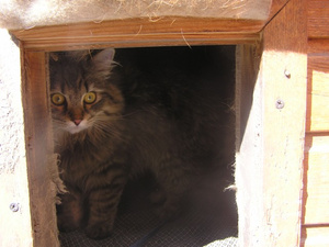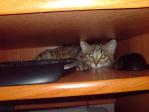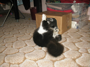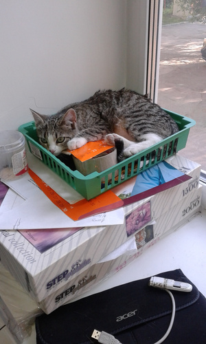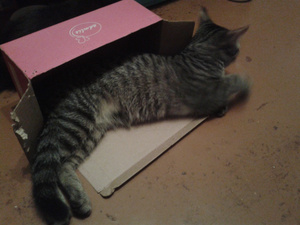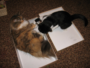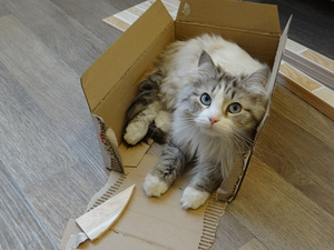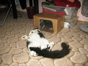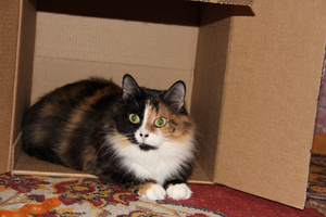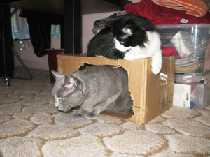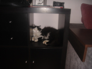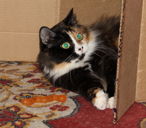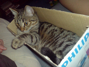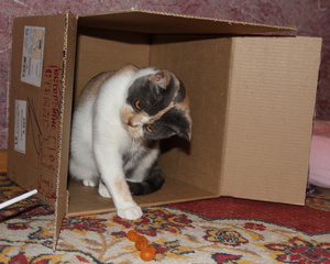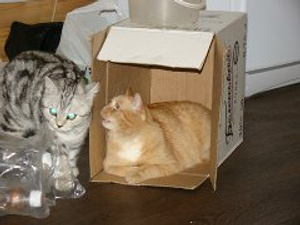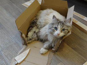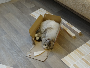 Вот ,из четырех подобрашек первая освоилась,приглядела себе коробушечку А сегодня уже все по очериди выгоняли друг друга