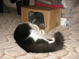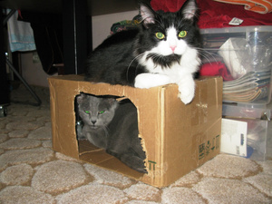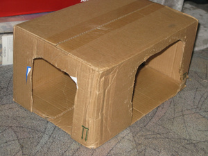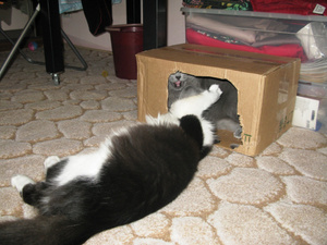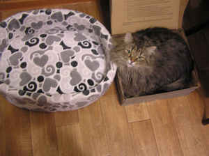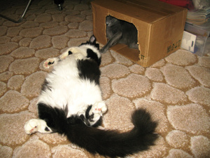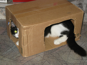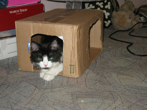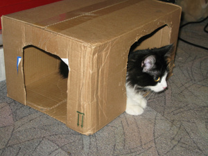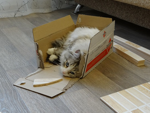 А я так и не убрала магазинную коробку с прорезанными дырками! Хотя есть сшитый домик и купленный домик с когтеточкой, коты тусуются в просто коробушке!