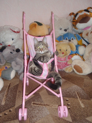 Любимая игра в "сыночки-матери" . Кот в полном восторге,только держаться крепко велели,чтоб не упасть на повороте.![]()