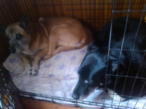 Таня прислала уютные фоточки с Бароном и пишет:" На фото он у себя в клетке с девочкой Джесси. После того, как я ему добавила еще и подушку на лежанку, все собаки стали стремиться попасть к нему в клетку на мягкое. Самые смелые остаются даже тогда, когда он там ложится"