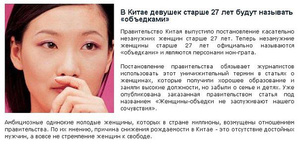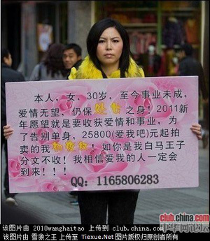 вы не в теме. дети в китае сейчас на положении "маленьких императоров", а девочек значительно меньше мальчиков. и как бы поразительный (на первый взгляд) факт - женщины оказываются не востребованы. вот примерчик подобного отчаяния - на плакате написано (близко к тексту - в словарь лезть не охота) - "мне 30 лет, я одинока. за 25800 юаней готова вступить в отношения, если будет хороший человек - деньги потом верну" ни и адрес кукушки (китайской аськи национального маштаба).