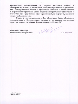 B связи c этим мы рекомендуем Вам обратиться с Вашим обращением непосредственно в i1екоммерческое партнерство поставщиков программных продуктов, по адресу: г. Москва, Кулаков переулок, д. 1 l офис 207.