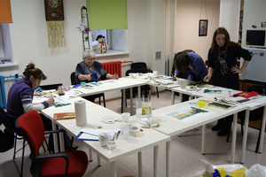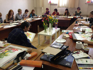 Мастер-класс начался в 12.00, весь периметр столов быстро покрылся творческим беспорядком. Сначала инструктор рассказывал о тонкостях акварельной живописи, но присутствовавшим быстро надоело его слушать и все стали увлеченно рисовать