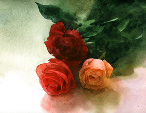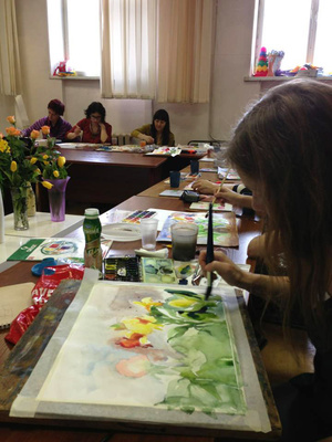 Программа: рассказываю и показываю различные техники работы с акварелью применительно к теме цветов. Основы композиции, цветоведения: 1 час. Затем совместная работа над постановкой: 3 часа.