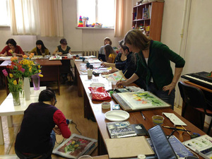 Сначала стояла гробовая тишина, только шуршание кисточек... Потом все оживились, преподаватель "пошел по рукам", -- много вопросов, переходил от стола к столу. Объяснял, показывал.. Поэтому мой шедевр остался незаконченным, я нисколько об этом не жалею. Удивительный итог -- у всех вышли замечательные работы! У каждой свой характер, каждый участник взял из большого цветочного стола, то что ему больше пришлось по вкусу, все работы разные: декоративные, близкие к натуре, колоритные и приглушенные.