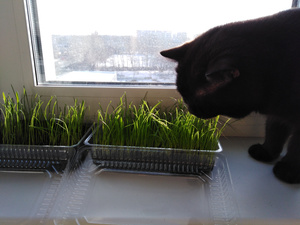 Дома коту траву посадила в вс - уже колосится, он на неё как-то странно смотрит... Гоняю, что грызёт мои комнатные цветы, может поэтому.