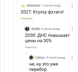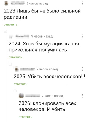 мемчик седня видела типа 22г лишь бы не ядерная война, 27г. вот бы прикольная какая мутация была, 30г. убить всех человеков! 35г. ДНС повысили цены на 50%. вот козлы!