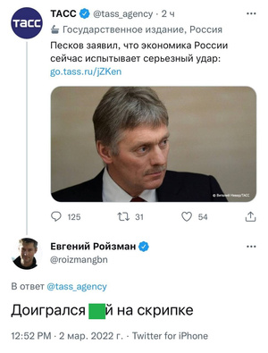 мысли Ройзмана в твитах под постами государственных пропагандистов не всегда поддаются мгновенной расшифровке, но очень часто нарушают п. 5 правил форума НГСлюблю ройзмана, надо смеяться, чтобы кукуха не улетела сейчас.