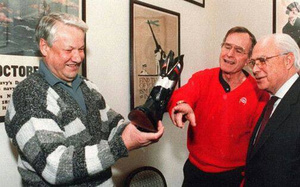 Ельцин празднует свой 61 день рождения в Америке и получает в подарок от Джорджа Буша старшего техасский башмак, 1 февраля 1992 года, резиденция президента США.