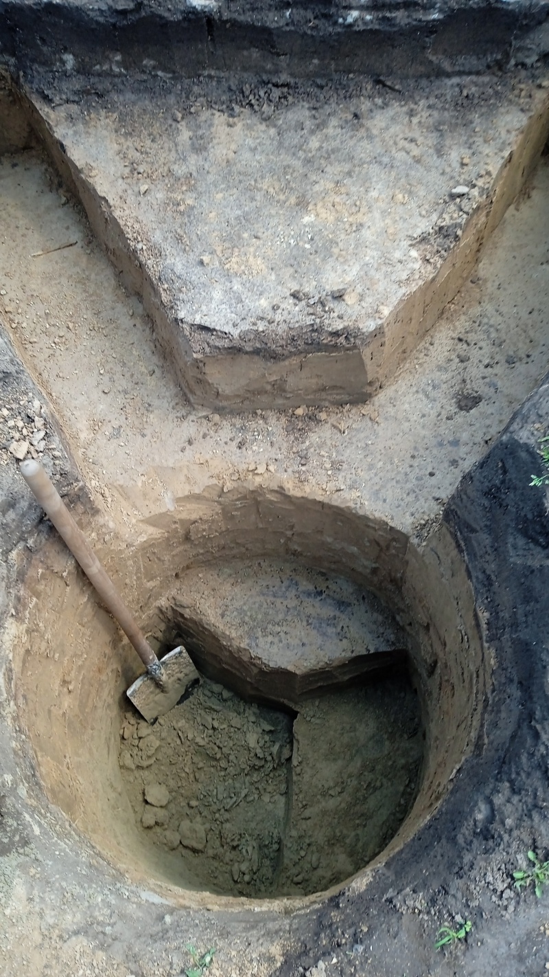 А первую яму. Которая строго цилиндрической формы чем копали?лопата штыковая + лопата совковая + снова штыковая + кельма + два вёдра 10 и 12 литров + тачка на 90 (или 120?) литров