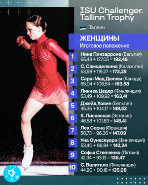Самоделкина стала второй на Tallinn Trophy (173,25). Ее опередила Пинзарроне (192,48). Дюпуи (163,58) – 3-я