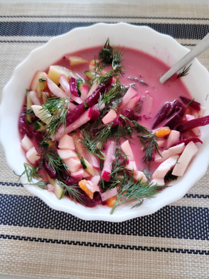 Вижу редиску, картошку, укроп. Свекла на бульон пошла? Что-то ещё?