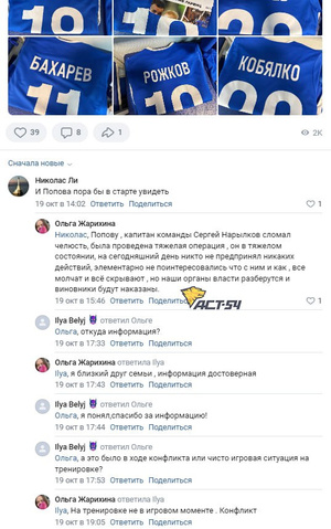 Капитан футбольной «Сибири» сломал челюсть своему младшему партнёру по команде Константину Попову в результате конфликта на тренировке – утверждает болельщица Ольга в комментариях под одной из публикаций в официальной группе клуба ВКонтакте