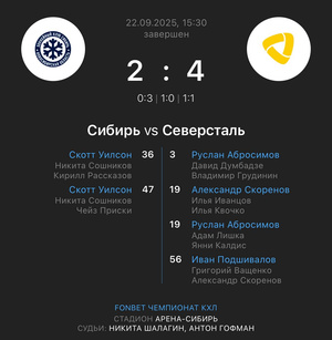 «Сибирь» (Новосибирская область) — «Салават Юлаев» (Уфа) — 3:2 Б (0:1, 0:1, 2:0, 1:0)