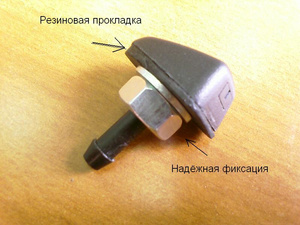 Сделал тюнинг вольвовской форсунки. Сделал клиновидную резиновую прокладочку для корректировки угла разбрызгивания и сделал надёжную фиксацию к кузову.