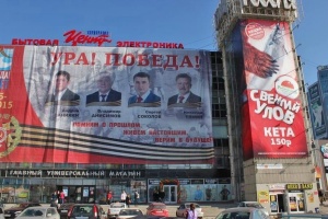 Очень сильно удивило!! Вот такой замечательный транспарант, размещенный на здании ГУМа, вчера увидела и просто потеряла дар речи, когда разглядела чьи... слово пытаюсь подобрать.. ладно, пусть будут лица, изображены. Это уж совсем, вообще... Слов нет.. Сами посмотрите. Стесняюсь спросить, в каких таких боях-сражениях эти "герои" участвовали?