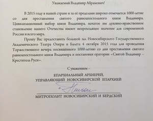 Митрополит Новосибирский и Бердский Тихон обратился к директору Новосибирского оперного театра Владимиру Кехману с просьбой провести 4 октября в большом зале театра торжественный вечер, посвященный 1000-летию со дня смерти князя Владимира, а также постановку оратории «Святой Владимир — Креститель Руси». (взято из паблика "вк"